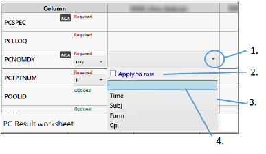 The remaining columns in the Map PC Variables table list the source data column name for each data source selected in the previous page of the wizard, one column per selected data source. If the source data file does not have the mapping for the PC domain variable, the cell is empty. If the empty cell is a required field, it will be highlighted in red.