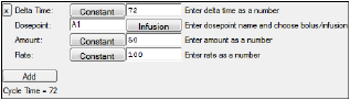 For example, to simulate an additional number of infusions of 50 dose units infused at a rate of 100 every 72 time units, the following selections must be made: